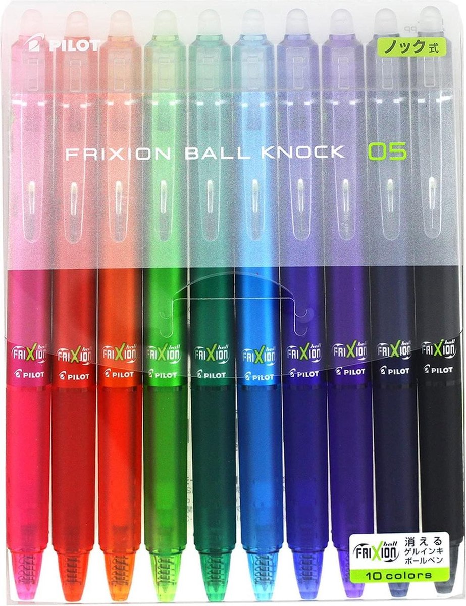 De langverwachte kliksysteem versie van de populaire Pilot FriXion lijn is nu verkrijgbaar! De Pen is voorzien van dezelfde geliefde thermogevoelige inkt die kan worden gewist door wrijving, maar nu wordt geleverd in een slanke, retractable versie. Druk gewoon op de clip om de tip uit te breiden en in te trekken. Een subtiele gele kleur verschijnt langs de kant van de pen om aan te geven wanneer de pen wordt verlengd. De pen schrijft soepel en wist zonder een spoor achter te laten! De set van 10 bevat de kleuren: zwart, rood, blauw, blauw zwart, groen, lichtgroen, oranje, roze, lichtblauw en violet. LFBK-230EF-10C