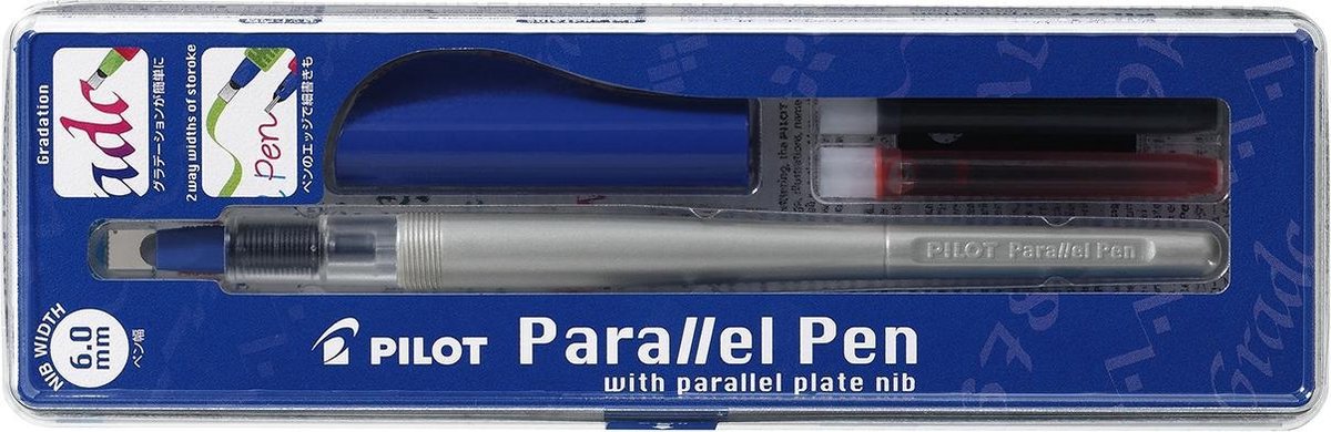De grote doorbraak in het ontwerp van kalligrafie pennen! Door de unieke structuur van de penpunt heeft Pilot's Parallel Pen een mooiere en scherpere handtekening dan elke andere kalligrafie pen. Penbreedte: 6.0mm (blauwe dop) Elke set bevat : 1 Parallel pen twee patronen (rood en zwart) een penpunt reiniger en een reinigingsconverter. Dé bijzondere kalligrafie vulpen voor zeer mooi kalligrafeerwerk. De penpunt van de Parallel Pen wordt gevormd door 2 laterale plaatjes. U krijgt een fantastisch kleureffect door de kleuren van de ene punt in de andere te laten overvloeien. + Kalligrafieblok A4. geruit schrijfpapier 95g/, 96 pagina's.
