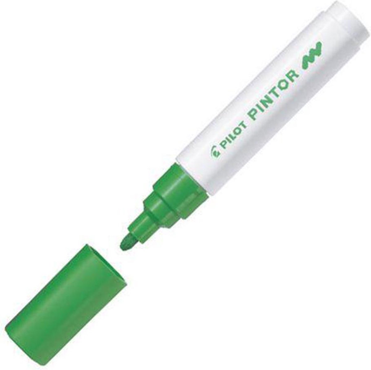 Pilot Pintor Medium Marker Deze Pilot Pintor Medium marker is beschikbaar in 24 kleuren en heeft een schrijfbreedte van 1,4mm met een puntgrootte van 4.5mm. De pigment-rijke Pilot Pintor inkt op waterbasis, dekt op elk oppervlak, zelfs de donkerste. Teken, kleur, versier, markeer, schrijf, kalligrafeer… bevrijd je verbeelding! Pilot Pintor geeft je de kans om je creatieve talenten op een intensieve manier over te brengen. Het resultaat zijn de kleuren van jouw inspiratie! De Pilot Pintor houdt op elk materiaal: papier, hout, glas, aardewerk, plastic, metaal, stof, etc.