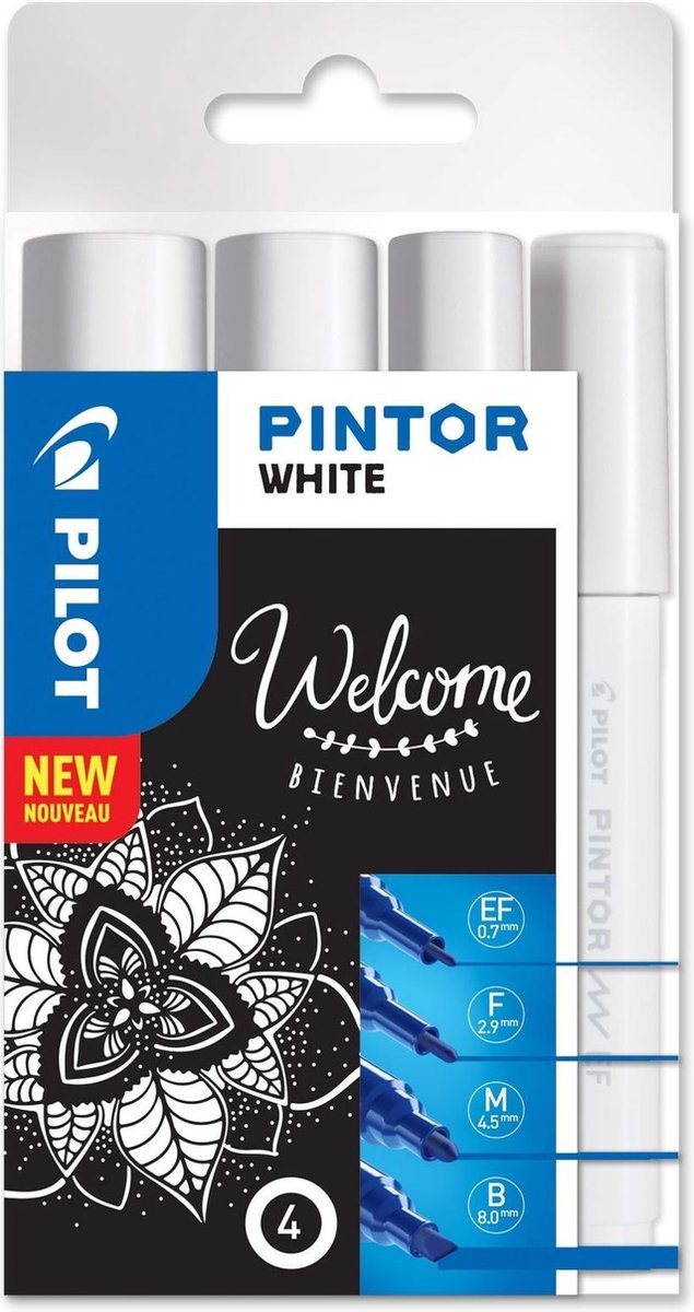 Pilot Pintor Welcome Set Wit 4 Stuks – EF/F/M/B Met deze welcome set beschikt u over 4 witte verfstiften in de maten: EF (2.3mm) – F (2.9mm) – M (4.5mm) – B (8.0mm). De pigment-rijke Pilot Pintor inkt op waterbasis, dekt op elk oppervlak, zelfs de donkerste. Teken, kleur, versier, markeer, schrijf, kalligrafeer… bevrijd je verbeelding! Pilot Pintor geeft je de kans om je creatieve talenten op een intensieve manier over te brengen. Het resultaat zijn de kleuren van jouw inspiratie! De Pilot Pintor houdt op elk materiaal: papier, hout, glas, aardewerk, plastic, metaal, stof, etc.