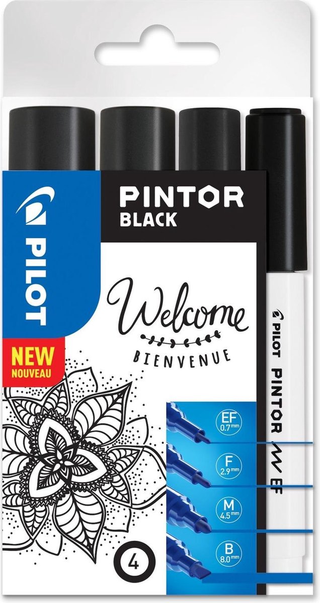 Pilot Pintor Welcome Set Zwart 4 Stuks – EF/F/M/B Met deze welcome set waar 3 Pilot Pintor Extra Fine markers in zitten, beschikt u over 4 zwarte verfstiften in de maten: EF (2.3mm) – F (2.9mm) – M (4.5mm) – B (8.0mm). De pigment-rijke Pilot Pintor inkt op waterbasis, dekt op elk oppervlak, zelfs de donkerste. Teken, kleur, versier, markeer, schrijf, kalligrafeer… bevrijd je verbeelding! Pilot Pintor geeft je de kans om je creatieve talenten op een intensieve manier over te brengen. Het resultaat zijn de kleuren van jouw inspiratie! De Pilot Pintor houdt op elk materiaal: papier, hout, glas, aardewerk, plastic, metaal, stof, etc.