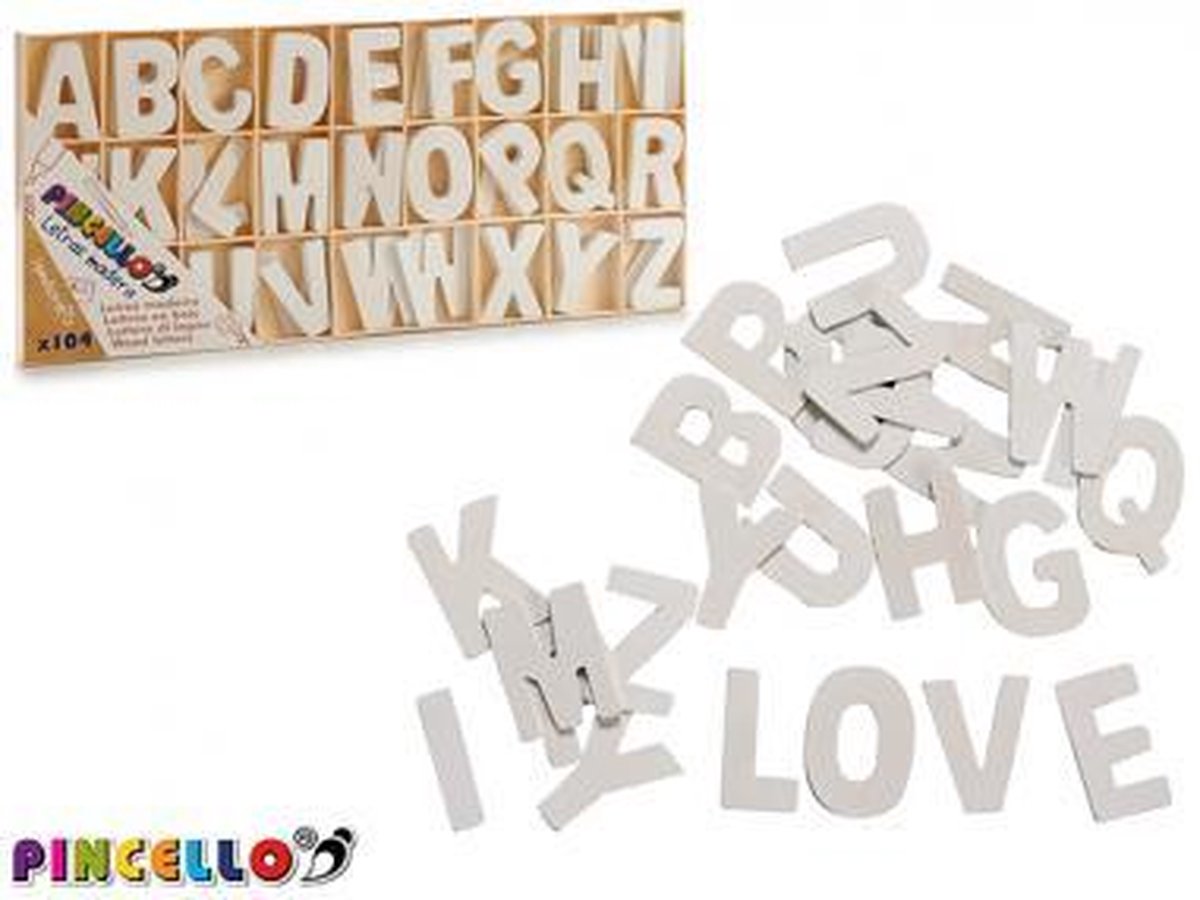 Set houten letters ter decoratie. Set bevat 26 tekens, van elk 4 stuks