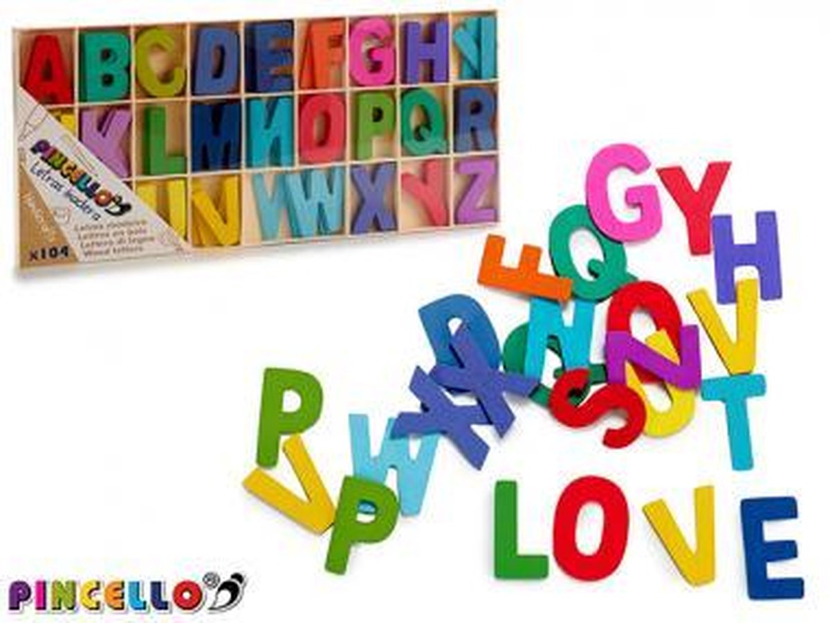 Set houten letters ter decoratie. Set bevat 26 tekens, van elk 4 stuks