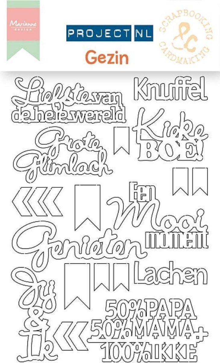 Chip board gezin,Afmeting A5, 10 NL teksten en 10 tekens, Marianne Design. De teksten zijn voorgestanst en eenvoudig uit het board te drukken. Mooi voor op je scrappagina in het fotoalbum of fotolijst