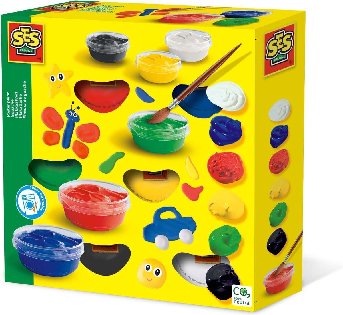 De plakkaatverf van SES staat bekend om haar kwaliteit en vooral de heldere, goed dekkende kleuren van deze verf. De plakkaatverf bevat zes kleuren: Rood, geel, blauw, groen, zwart en wit. Door deze kleuren met elkaar te mengen kun je nog veel meer verfkleuren creëren. Welke kleuren ga jij met elkaar mengen? De plakkaatverf van SES is goed uitwasbaar uit de meeste textielsoorten. Eigenschappen: Heldere kleuren; Goede afwerking; Extra dekkende plakkaatverf; Makkelijk uitwasbaar; Hypoallergeen; Glutenvrij