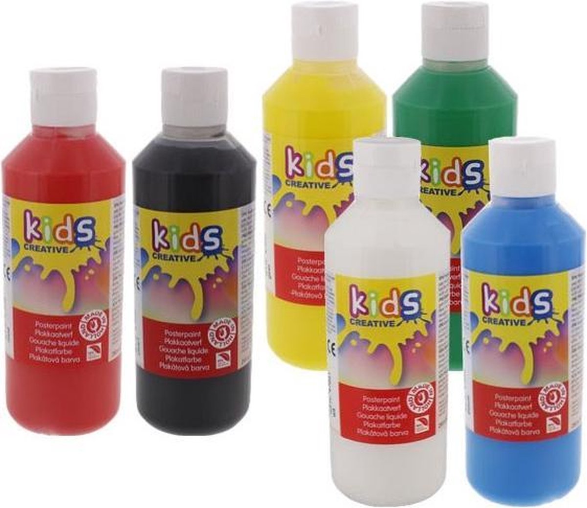Set 6 flesjes 250ML plakkaatverf. Deze set bevat de volgende kleuren: Zwart - Wit - Rood - Geel - Groen - Blauw.