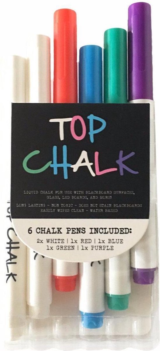 6 Vloeibare Krijtstiften met een fijne punt: 2 wit, 1 rood, 1 blauw, 1 groen, 1 paars. Schrijf en wis op jouw Planetary Design producten, schoolborden, LED-borden, glas en meer! Gemakkelijk te verwijderen met een vochtige doek. Op waterbasis en niet giftig.
