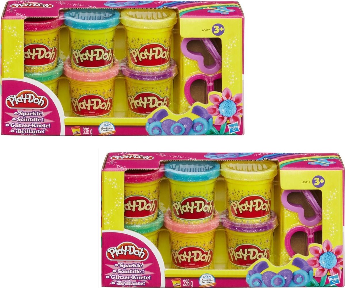 Maak Play-Doh-creaties sprankelend met deze collectie! Met 6 kleuren in potjes van 57 gram kunnen kinderen zich allerlei schitterende creaties maken met twinkelende, glitterachtige, niet-giftige Play-Doh-boetseermateriaal. Kinderen kunnen doen alsof hun Play-Doh-potjes zijn bestrooid met sprookjesstof en deze 6 sprankelende kleuren gebruiken om glinsterende scènes te maken met vlinder- en hartvormpjes. Combineer deze collectie met andere Play-Doh-speelsets of -sets en laat het schitteren! Voor de aangegeven prijs ontvangt u 2 verpakkingen met daarin 12 potjes totaal.