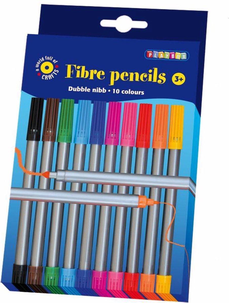 Stiften in 10 verschillende kleuren. Met een dikke en een dunne kop. 17 cm lang, 1 cm breed.