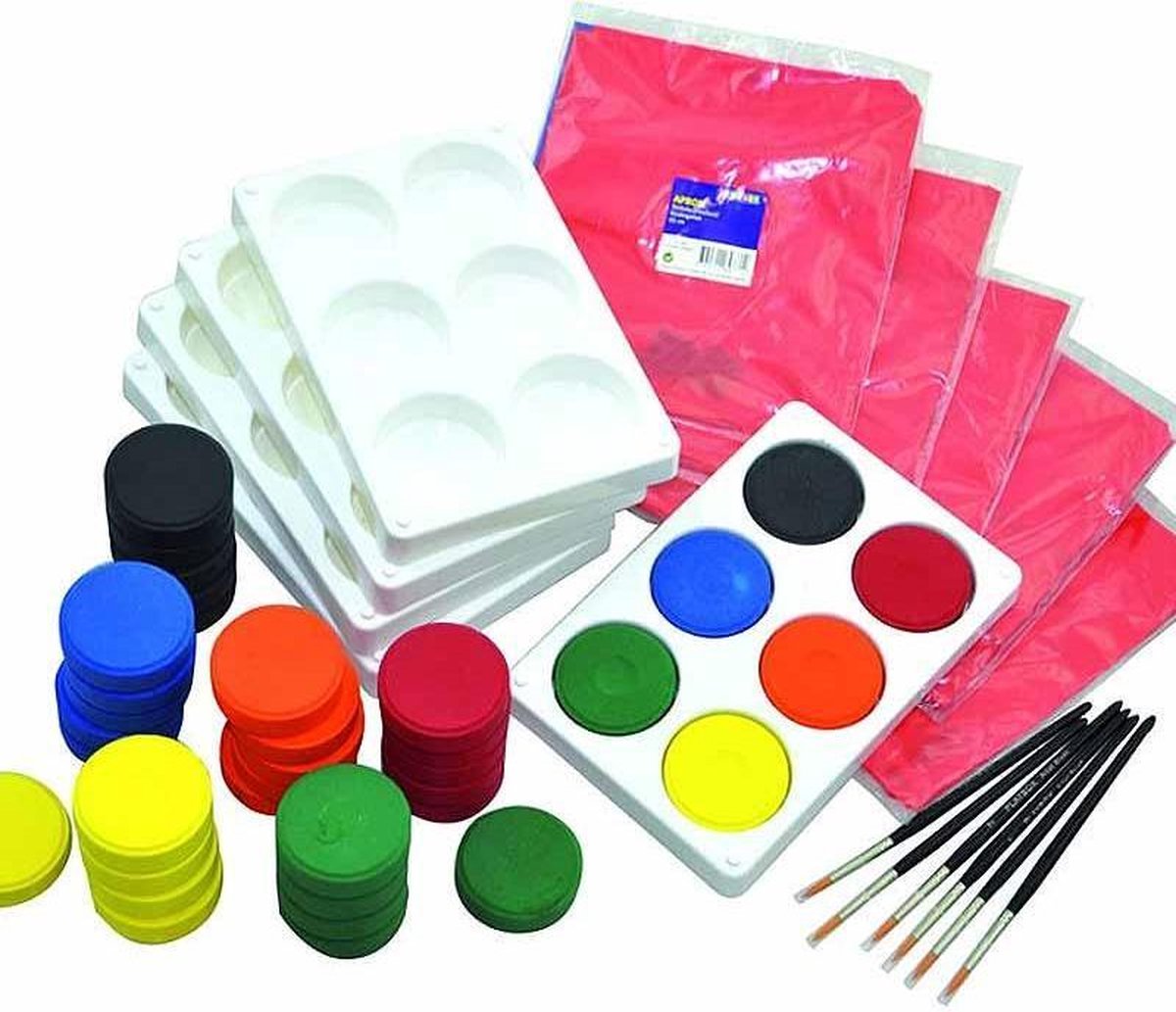 Ideaal voor onthaalmoeders, kleuterklasjes, verenigingen. Deze startset biedt jou 5 schilderspaletten met verftabletten in 6 kleuren: rood, geel, blauw, groen, zwart en bruin. Er zitten ook schorten en penselen bij. Alles zit netjes samen in een mooie opbergdoos.