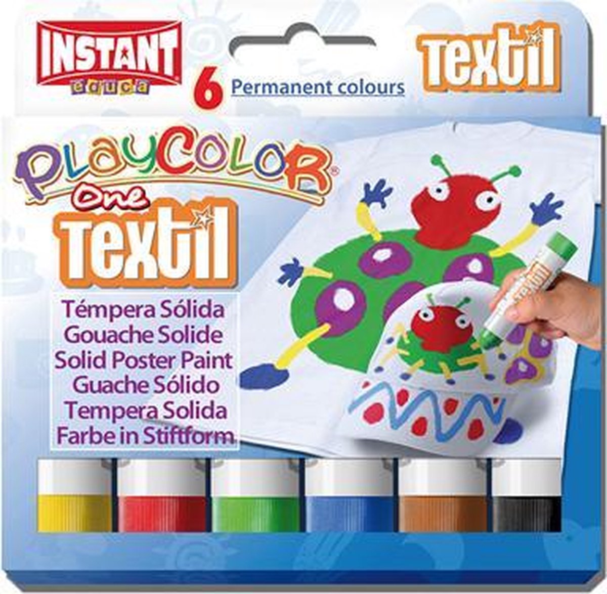 Playcolor Textil one, u ontvangt 6 dikke stiften in geel, groen, rood, blauw paars en zwart. De stiften zijn permanent. U ontvangt tevens GRATIS een t-shirt ( maat 9 - 10 jaar). Bebruiksaanwijzing; u plaatst een stuk karton tussen het t-shirt of achter ander weefsel en houdt het strak en kreukvrij. Decoreer naar hartelust. Zodra het droog is, plaatst u een vel hittebestendig papier op uw ontwerp en strijkt u het ongeveer 3-4 minuten lang totdat het hardt. Eenmaal klaar, kan de stof in de wasmachine worden gewassen tot 60 ° C / 140 ° F. 10g (binnenstebuiten ) kleurenapplicators. Inclusief 6 verschillende kleuren.