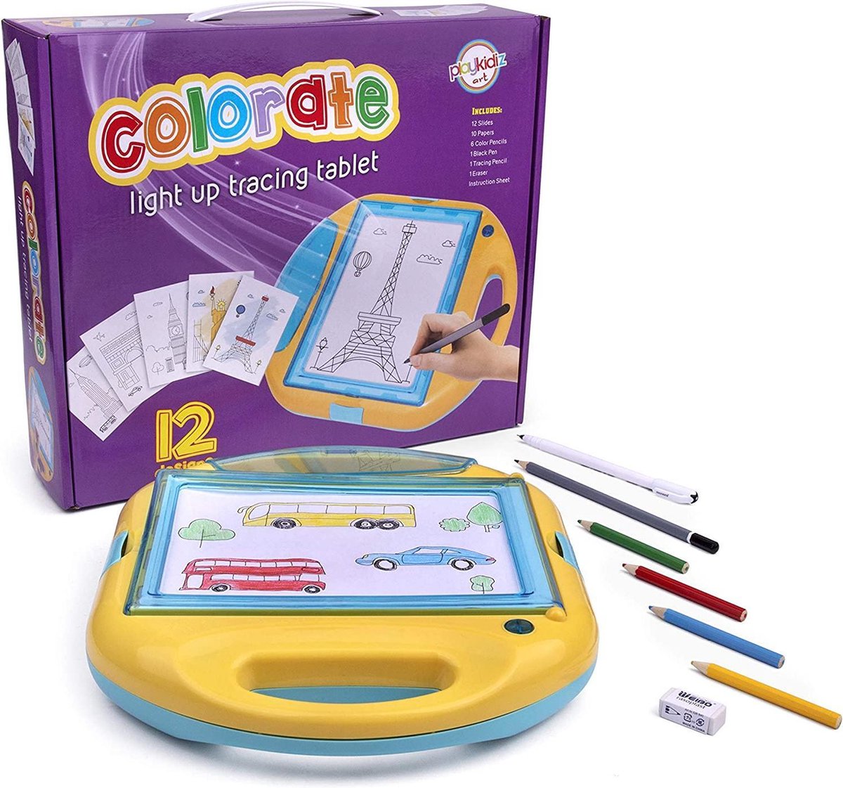 Kids will draw like a pro with the Playkidiz colorate light up tracing tablet featuring over 30 art supplies to inspire their imagination.Different than the other drawing boards and pads. This is not just a boring drawing and coloring sheet! Have your child trace an artistic image on this light up tracing pad.Give kids the confidence to create with the included coloring board and art supplies! They will place any of the 10 tracing sheets on the light up tracing pad to trace the pictures and designs.Once the picture is drawn it will be fun to color in their very own artistic work!Are you looking to buy a gift that your loved one will surely be thrilled by? This will make the ultra gift and is great for holiday, birthday parties etc.Never worry about the quality of this item. You may be sure this is made up of super durable top quality material. This Product Includes: 12 x Slides10 Tracing Papers6 x Color Pencils1 x Black Pen1 x Tracing Pencil1 x EraserInstruction Sheet