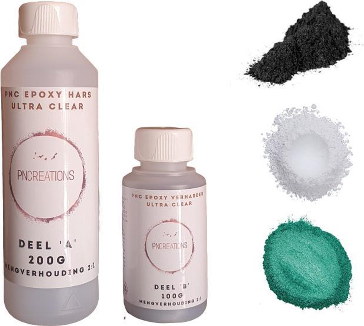 PNCreations Epoxy Super Clear Hars Inclusief: 200 Gram PNC Epoxy Super Clear Hars (A) 100 Gram PNC Epoxy Super Clear Verharder (B) 1.5 Gram Metallic Black Pigmentpoeder 1.5 Gram Snow Cristal White Pigmentpoeder 1.5 Gram Ocean Green Pigmentpoeder 1 Informatieve Handleiding PNC Epoxy Hars komt tot stand door de juiste afweging en samenvoeging van 2 componenten. Component ‘A’ is de Epoxy Hars zelf, component ‘B’ is de Epoxy Verharder. PNC Epoxy Hars is in principe kleur- en geurloos, eens de PNC Epoxy Hars is uitgehard heeft het geen schadelijke gevolgen voor mens en dier. Onze PNCreations Epoxyhars is van hoge kwaliteit. Eigen Epoxyhars juwelen maken Epoxyhars is zeer populair voor het maken van juwelen. Hangers voor kettingen Oorbellen (studs, hangers) Ringen Armbanden Haarspelden Vormpjes gieten in siliconen mallen is de meest voorkomende vorm om zelf juwelen te maken. - In combinatie met hout - In combinatie met edelmetalen - In combinatie met polyester - In combinatie gips