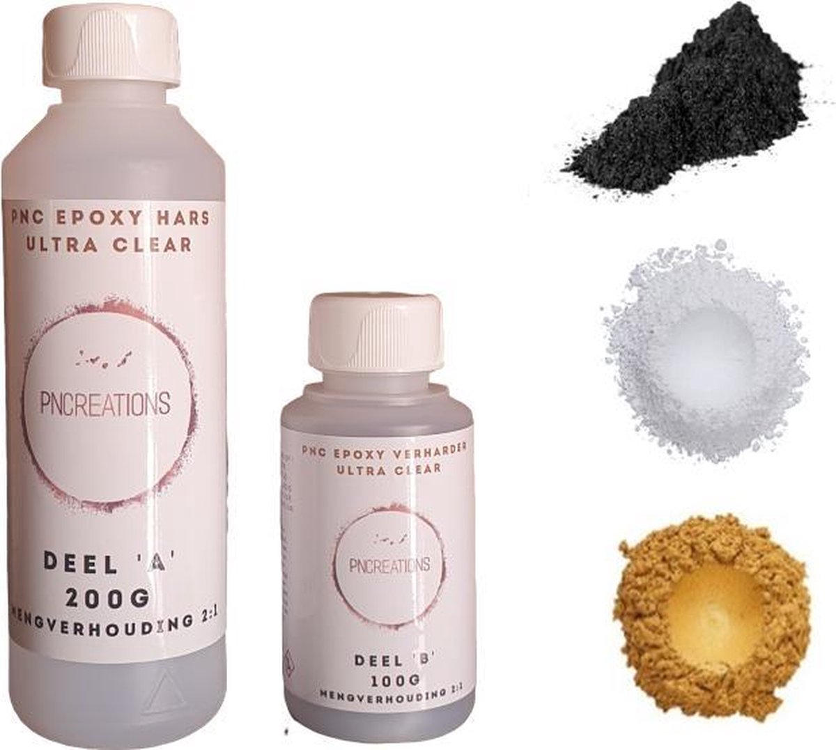 PNCreations Epoxy Super Clear Hars Inclusief: 200 Gram PNC Epoxy Super Clear Hars (A) 100 Gram PNC Epoxy Super Clear Verharder (B) 1.5 Gram Metallic Black Pigmentpoeder 1.5 Gram Snow Cristal White Pigmentpoeder 1.5 Gram Treasure Gold Pigmentpoeder 1 Informatieve Handleiding PNC Epoxy Hars komt tot stand door de juiste afweging en samenvoeging van 2 componenten. Component ‘A’ is de Epoxy Hars zelf, component ‘B’ is de Epoxy Verharder. PNC Epoxy Hars is in principe kleur- en geurloos, eens de PNC Epoxy Hars is uitgehard heeft het geen schadelijke gevolgen voor mens en dier. Onze PNCreations Epoxyhars is van hoge kwaliteit. Eigen Epoxyhars juwelen maken Epoxyhars is zeer populair voor het maken van juwelen. Hangers voor kettingen Oorbellen (studs, hangers) Ringen Armbanden Haarspelden Vormpjes gieten in siliconen mallen is de meest voorkomende vorm om zelf juwelen te maken. - In combinatie met hout - In combinatie met edelmetalen - In combinatie met polyester - In combinatie