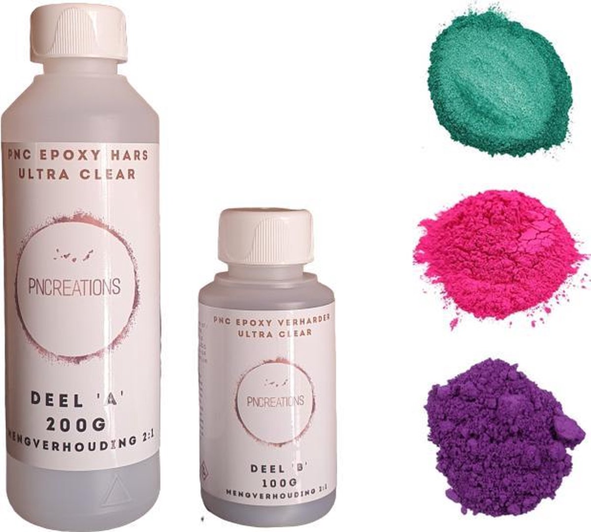 PNCreations Epoxy Super Clear Hars Inclusief: 200 Gram PNC Epoxy Super Clear Hars (A) 100 Gram PNC Epoxy Super Clear Verharder (B) 1.5 Gram Ocean Green Pigmentpoeder 1.5 Gram Pretty Pink Pigmentpoeder 1.5 Gram Deep Purple Pigmentpoeder 1 Informatieve Handleiding PNC Epoxy Hars komt tot stand door de juiste afweging en samenvoeging van 2 componenten. Component ‘A’ is de Epoxy Hars zelf, component ‘B’ is de Epoxy Verharder. PNC Epoxy Hars is in principe kleur- en geurloos, eens de PNC Epoxy Hars is uitgehard heeft het geen schadelijke gevolgen voor mens en dier. Onze PNCreations Epoxyhars is van hoge kwaliteit. Eigen Epoxyhars juwelen maken Epoxyhars is zeer populair voor het maken van juwelen. Hangers voor kettingen Oorbellen (studs, hangers) Ringen Armbanden Haarspelden Vormpjes gieten in siliconen mallen is de meest voorkomende vorm om zelf juwelen te maken. - In combinatie met hout - In combinatie met edelmetalen - In combinatie met polyester - In combinatie gips Er zijn