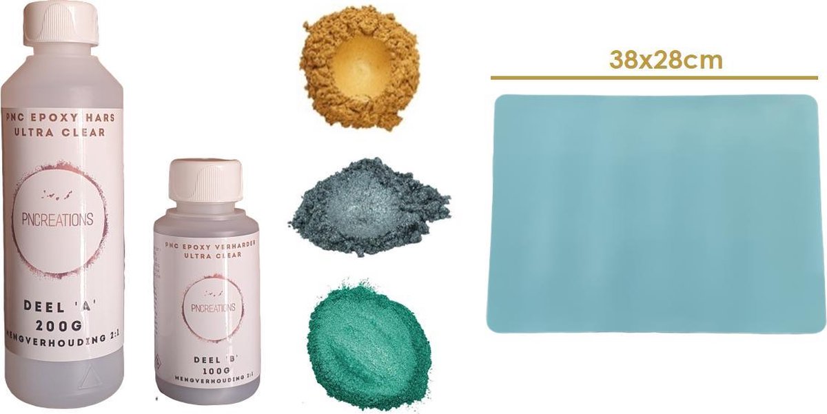 PNCreations Epoxy Super Clear Hars Inclusief: 200 Gram PNC Epoxy Super Clear Hars (A) 100 Gram PNC Epoxy Super Clear Verharder (B) 1 Grote Siliconen Mat (Blauw) 1.5 Gram Treasure Gold Pigmentpoeder 1.5 Gram Silver Grey Pigmentpoeder 1.5 Gram Ocean Green Pigmentpoeder 1 Informatieve Handleiding PNC Epoxy Hars komt tot stand door de juiste afweging en samenvoeging van 2 componenten. Component ‘A’ is de Epoxy Hars zelf, component ‘B’ is de Epoxy Verharder. PNC Epoxy Hars is in principe kleur- en geurloos, eens de PNC Epoxy Hars is uitgehard heeft het geen schadelijke gevolgen voor mens en dier. Onze PNCreations Epoxyhars is van hoge kwaliteit. Eigen Epoxyhars juwelen maken Epoxyhars is zeer populair voor het maken van juwelen. Hangers voor kettingen Oorbellen (studs, hangers) Ringen Armbanden Haarspelden Vormpjes gieten in siliconen mallen is de meest voorkomende vorm om zelf juwelen te maken. - In combinatie met hout - In combinatie met edelmetalen - In combinatie met polyester