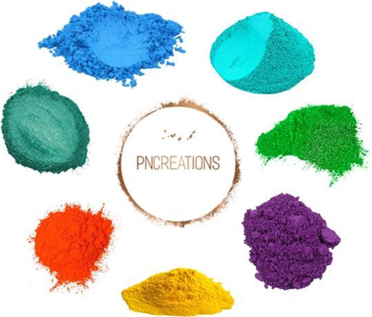 PNCreations Pigmentpoeder | Kleurpoeder Inclusief: 1.5 gram Banana Yellow Pigmentpoeder 1.5 gram Bright Orange Pigmentpoeder 1.5 gram Ocean Green Pigmentpoeder 1.5 gram Forza Blue Pigmentpoeder 1.5 gram Turquoise Pigmentpoeder 1.5 gram Blasty Green Pigmentpoeder 1.5 gram Deep Purple Pigmentpoeder PNCreations Pigmentpoeder kan gebruikt worden voor erg veel toepassingen! Zelf zijn wij gespecialiseerd in het maken van juwelen door middel van Epoxy (Kunsthars/Giethars). Maar de pigmentpoeder kan gebruikt worden om je eigen verf te mixen (opgelet dit is een toevoeging voor reeds bestaande verf, de pigmentpoeder zelf wordt geen verf), je eigen zeep te maken en nog veel meer. Epoxy is momenteel erg populair aan het worden in Europa, in Amerika is Epoxy sinds langere tijd al erg populair. Wij bieden verschillende starterspakketten aan met verschillende producten om van start te gaan en je eigen juwelen/creaties te maken met onze eigen hoog kwalitatieve PNCreations Epoxy Hars, check ze zeker