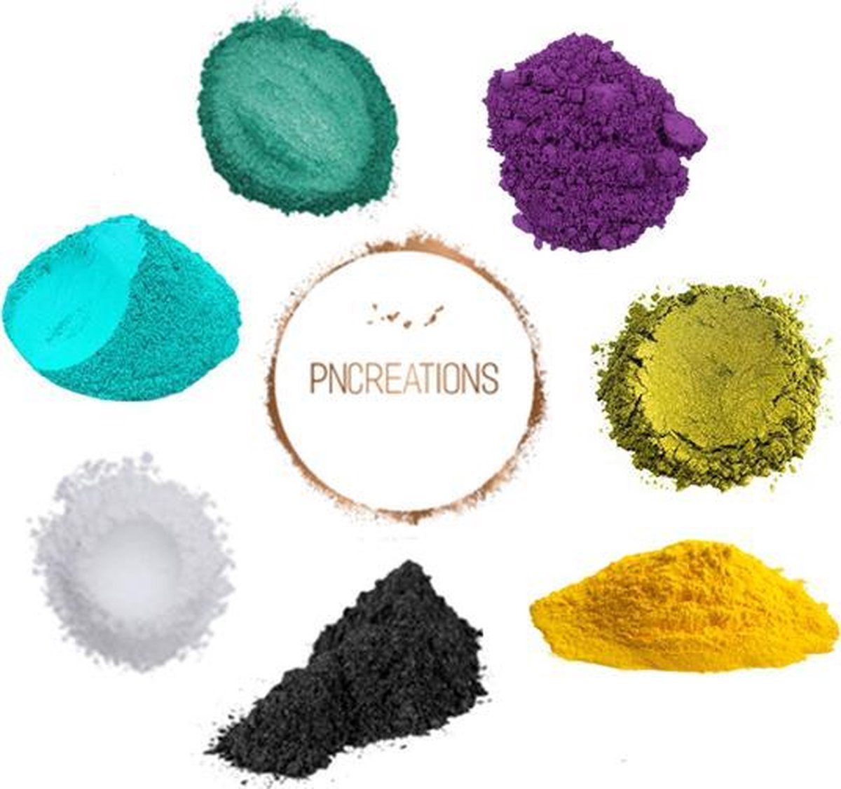 PNCreations Pigmentpoeder Mediterraanse Color Mix | Kleurpoeder Inclusief: 1.5 gram Metallic Black Pigmentpoeder 1.5 gram Snow Cristal White Pigmentpoeder 1.5 gram Turquoise Pigmentpoeder 1.5 gram Ocean Green Pigmentpoeder 1.5 gram Deep Purple Pigmentpoeder 1.5 gram Olive Green Pigmentpoeder 1.5 gram Banana Yellow Pigmentpoeder PNCreations Pigmentpoeder kan gebruikt worden voor erg veel toepassingen! Zelf zijn wij gespecialiseerd in het creëren van juwelen door middel van Epoxy (Kunsthars/Giethars). Maar de pigmentpoeder kan gebruikt worden om je eigen verf te mixen (opgelet dit is een toevoeging voor reeds bestaande verf, de pigmentpoeder zelf wordt geen verf), je eigen zeep te maken en nog veel meer. Epoxy is momenteel erg populair aan het worden in Europa, in Amerika is Epoxy sinds langere tijd al erg populair. Wij bieden verschillende starterspakketten aan met verschillende producten om van start te gaan en je eigen juwelen/creaties te maken met onze eigen hoog kwalitatieve