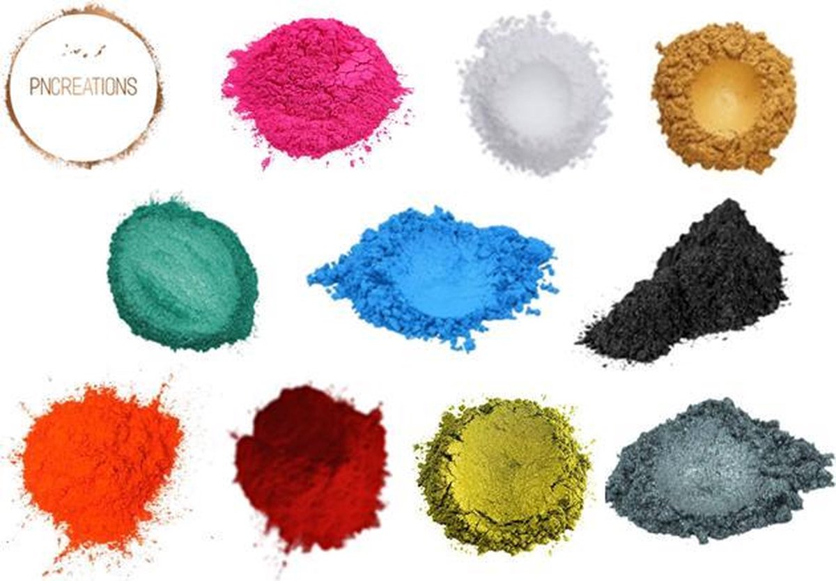 PNCreations Pigmentpoeder | Kleurpoeder | 10 Kleuren x 3 Gram! | Mica Inclusief: 3 gram Passion Red Pigmentpoeder 3 gram Snow Cristal White Pigmentpoeder 3 gram Forza Blue Pigmentpoeder 3 gram Metallic Black Pigmentpoeder 3 gram Pretty Pink Pigmentpoeder 3 gram Treasure Gold Pigmentpoeder 3 gram Ocean Green Pigmentpoeder 3 gram Silver Grey Pigmentpoeder 3 gram Bright Orange Pigmentpoeder 3 gram Olive Green Pigmentpoeder PNCreations Pigmentpoeder kan gebruikt worden voor erg veel toepassingen! Zelf zijn wij gespecialiseerd in het maken van juwelen door middel ven Epoxy (Kunsthars/Giethars). Maar de pigmentpoeder kan gebruikt worden om je eigen verf te mixen (opgelet dit is een toevoeging voor reeds bestaande verf, de pigmentpoeder zelf wordt geen verf), je eigen zeep te maken en nog veel meer. Epoxy is momenteel erg populair aan het worden in Europa, in Amerika is Epoxy sinds langere tijd al erg populair. Wij bieden verschillende starterspakketten aan met verschillende producten om