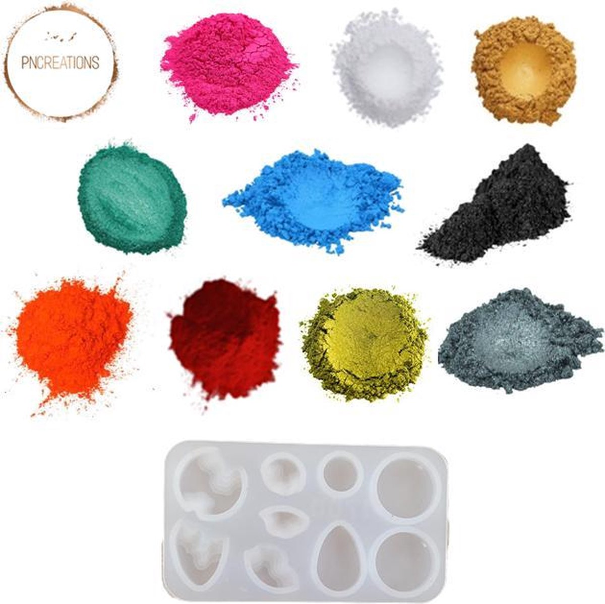 PNCreations Gietpakket Inclusief: Special Reliëfmal | Gelaagde Mal 3 gram Passion Red Pigmentpoeder 3 gram Snow Cristal White Pigmentpoeder 3 gram Forza Blue Pigmentpoeder 3 gram Metallic Black Pigmentpoeder 3 gram Pretty Pink Pigmentpoeder 3 gram Treasure Gold Pigmentpoeder 3 gram Ocean Green Pigmentpoeder 3 gram Silver Grey Pigmentpoeder 3 gram Bright Orange Pigmentpoeder 3 gram Olive Green Pigmentpoeder PNCreations Pigmentpoeder kan gebruikt worden voor erg veel toepassingen! Zelf zijn wij gespecialiseerd in het maken van juwelen door middel ven Epoxy (Kunsthars/Giethars). Maar de pigmentpoeder kan gebruikt worden om je eigen verf te mixen (opgelet dit is een toevoeging voor reeds bestaande verf, de pigmentpoeder zelf wordt geen verf), je eigen zeep te maken en nog veel meer. Epoxy is momenteel erg populair aan het worden in Europa, in Amerika is Epoxy sinds langere tijd al erg populair. Wij bieden verschillende starterspakketten aan met verschillende producten om van start te