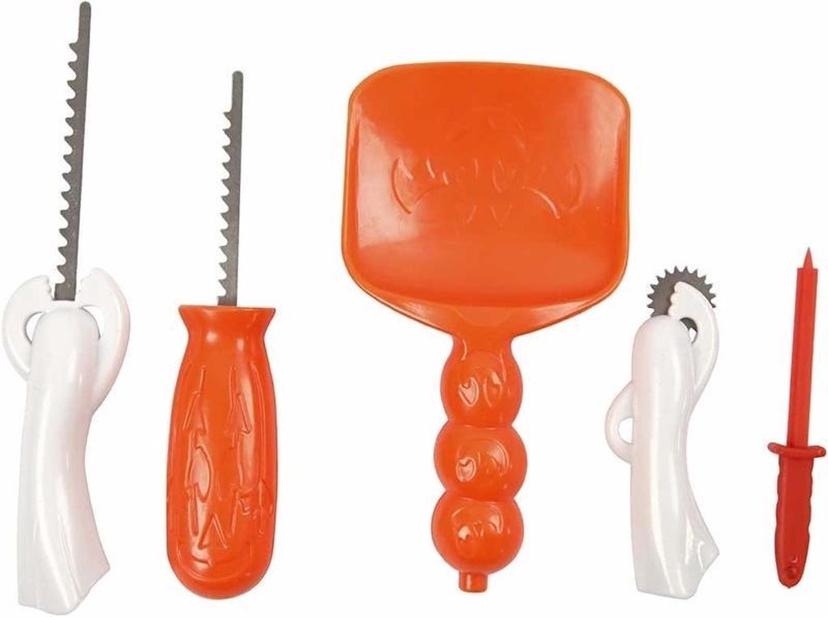 Pompoen gereedschapset. Complete set voor het uitsnijden van pompoenen. De set bevat 5 gereedschappen en een boekje met 7 sjablonen, afbeeldingen en instructies. Materiaal: Kunststof/metaal. Halloween pompoenen gereedschap om uit te hollen en figuren te maken.