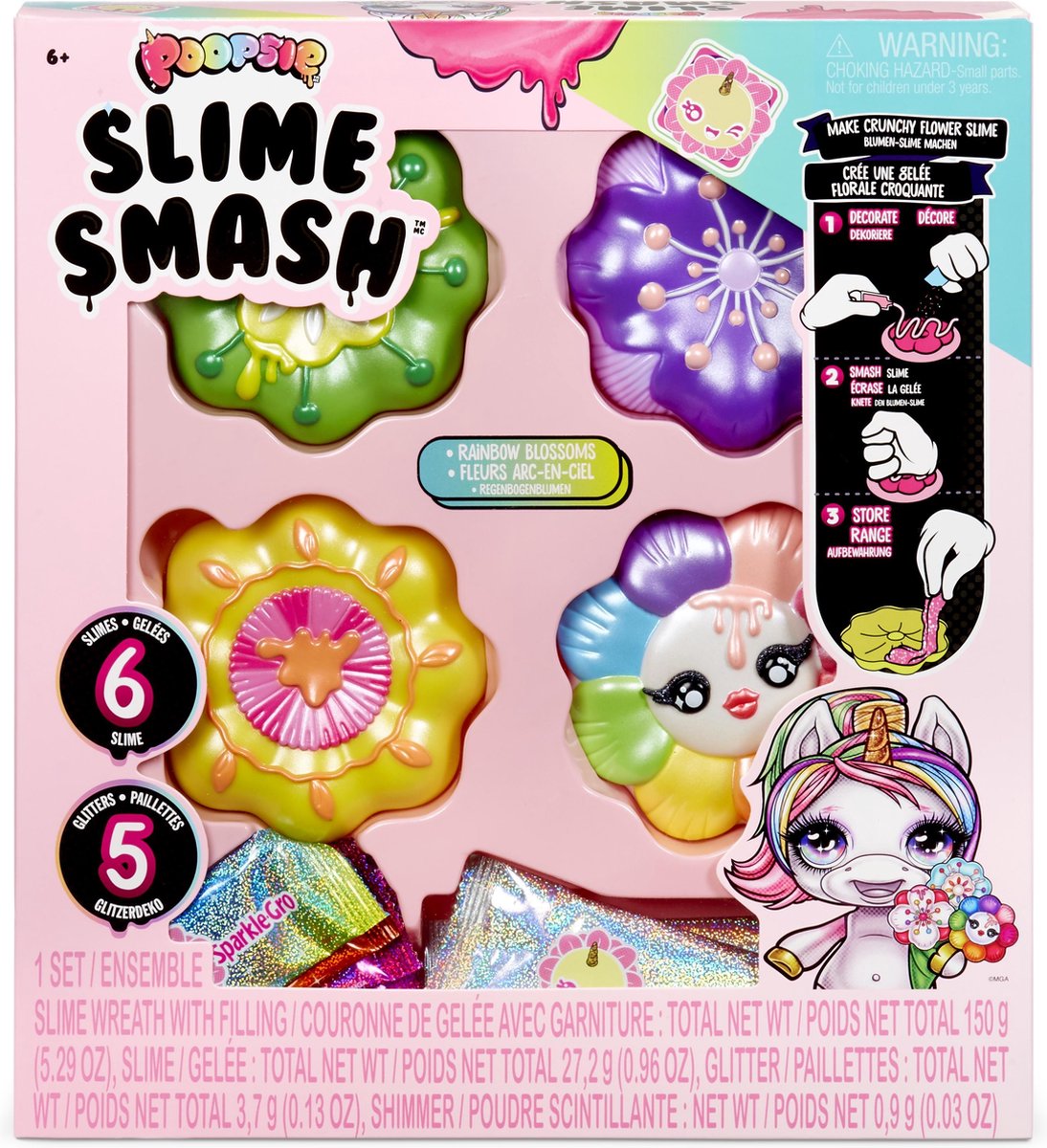 Maak een regenboog van knisperend bloemenslijm met Poopsie Slime Smash. Elke doos bevat 4 schattige bloemenvormen en alles wat je nodig hebt om je slijm te versieren. In elke vorm zit kant-en-klaar slijm met een knisperende glitterverrassing binnenin. Versier je slijm met sprankelende toppings en extra slijm. KNIJP de bloem samen om de knisperende verrassing binnenin te onthullen en meng de verschillende structuren door elkaar. Bewaar je slijm in de schattige bloemenvormen. Elke Slime Smash bevat 4 bloemenvormen met 4 slijm, 3 zakjes sprankels, 1 zakje glans, 1 zakje strooisel en 2 extra slijm. Verzamel alle 16 slijmbloemen.