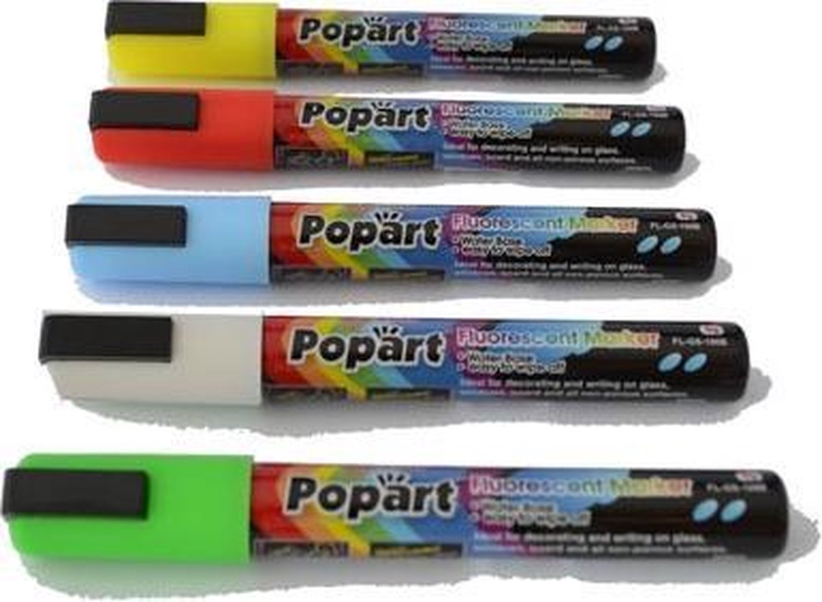 De Popart Krijtstift is de meest verkochte, met water uitwisbare krijtstift. De stift is gemakkelijk te verwijderen met een vochtige doek. De stiften worden per 5 stuks geleverd in de volgende kleuren: Blauw Groen Geel Rood Wit Kenmerken: Op waterbasis Ronde punt, dikte 5 mm Te gebruiken op al onze krijtborden Niet te gebruiken op poreuze oppervlakken en schoolbord- of muurverf