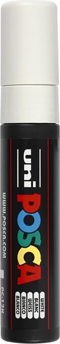 Posca marker Deze dekkende, permanente stift op waterbasis kun je gebruiken voor zowel gladde als poreuze oppervlakken. De extra brede en schuine punt is geschikt voor verven, tekenen en schrijven. Zo maak je van elke tekening een kunstwerk. Specificaties: Kleur: wit Materiaal: kunststof Lijndikte: 15 mm