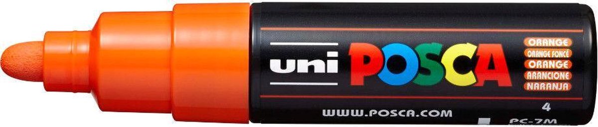 PC-7M 8 mm breed rond Posca PC-7m is de nieuwste UNI Posca Acrylstift. Deze ziet er van de buitenkant hetzelfde uit als de Posca PC-8K maar het verschil zit hem in de punt. De punt van de PC7M is rond en niet rechthoekig zoals de PC8K. Verkrijgbaar in 12 kleuren. De Posca PC-7M heeft een kogelvormige punt, met een dikte van 4.5 tot 5.5mm. De POSCA is een veelzijdige marker die op bijna elk oppervlak kan schrijven. Verder is deze permanente marker vervaagd niet en is waterbestendig. De inkt is kan op onderstaande oppervlakken permanent worden gemaakt door de beschrijving per materiaal toe te passen. - Glas - door 45 minuten in de oven op 160 ° C te bakken - Textiel - door de acterkant te strijken - Metaal, kunststof en hout - door af te spuiten met blanke lak - Terracotta - door gedurende 45 minuten op 220 ° C te bakken - Porselein - door gedurende 45 minuten op 160 ° C te bakken