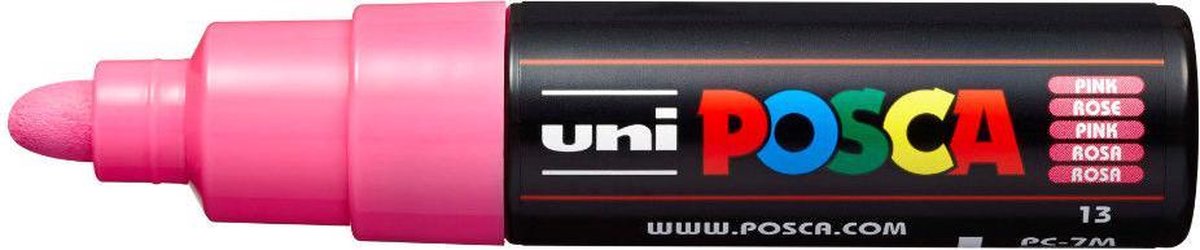 PC-7M 8 mm breed rond Posca PC-7m is de nieuwste UNI Posca Acrylstift. Deze ziet er van de buitenkant hetzelfde uit als de Posca PC-8K maar het verschil zit hem in de punt. De punt van de PC7M is rond en niet rechthoekig zoals de PC8K. Verkrijgbaar in 12 kleuren. De Posca PC-7M heeft een kogelvormige punt, met een dikte van 4.5 tot 5.5mm. De POSCA is een veelzijdige marker die op bijna elk oppervlak kan schrijven. Verder is deze permanente marker vervaagd niet en is waterbestendig. De inkt is kan op onderstaande oppervlakken permanent worden gemaakt door de beschrijving per materiaal toe te passen. - Glas - door 45 minuten in de oven op 160 ° C te bakken - Textiel - door de acterkant te strijken - Metaal, kunststof en hout - door af te spuiten met blanke lak - Terracotta - door gedurende 45 minuten op 220 ° C te bakken - Porselein - door gedurende 45 minuten op 160 ° C te bakken
