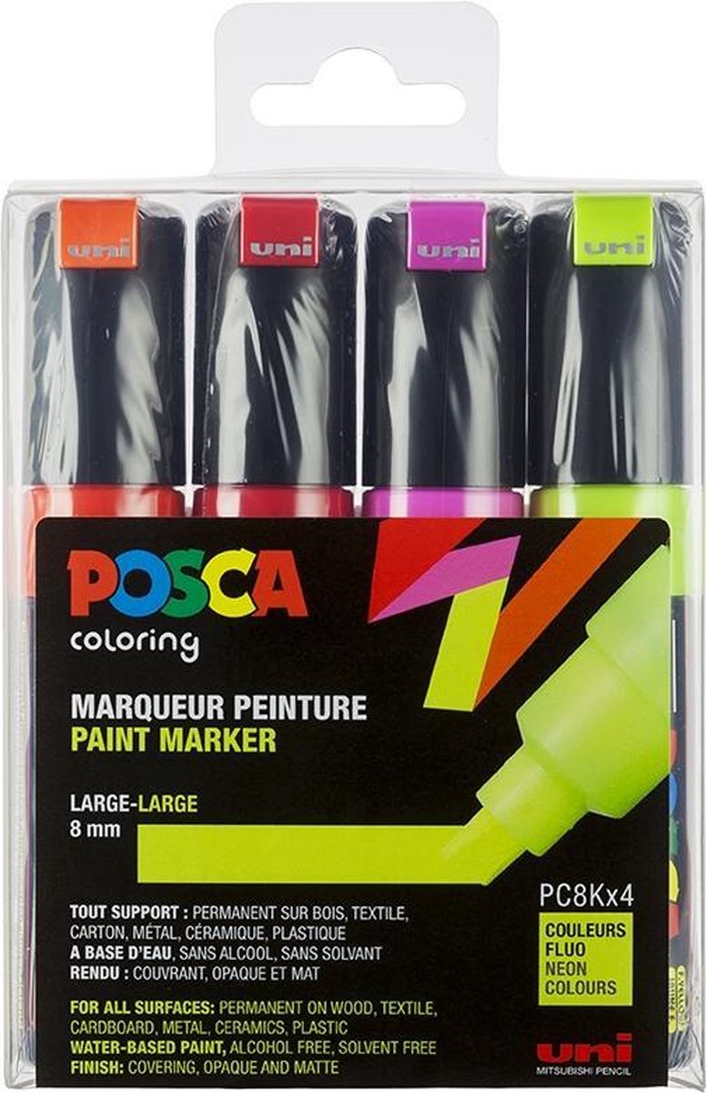 Posca set van 4 x PC-8K markers, geschikt voor de meeste toepassingen. Permanent op hout, textiel, karton, metaal, keramiek en plastic. Uitwisbaar op gladde oppervlakken zoals glas. Op metaal, plastic en geglazuurd aardewerk moet de creatie gefixeerd worden met een fixatielak. Kenmerken – Dikte: beitelpunt – Op waterbasis – Bevat geen alcohol of oplosmiddelen – Dekkend, ondoorzichtig en mat Deze set bevat 4 fluor neonkleuren; Fluorgeel, Fluorroze, fluorrood en fluororanje