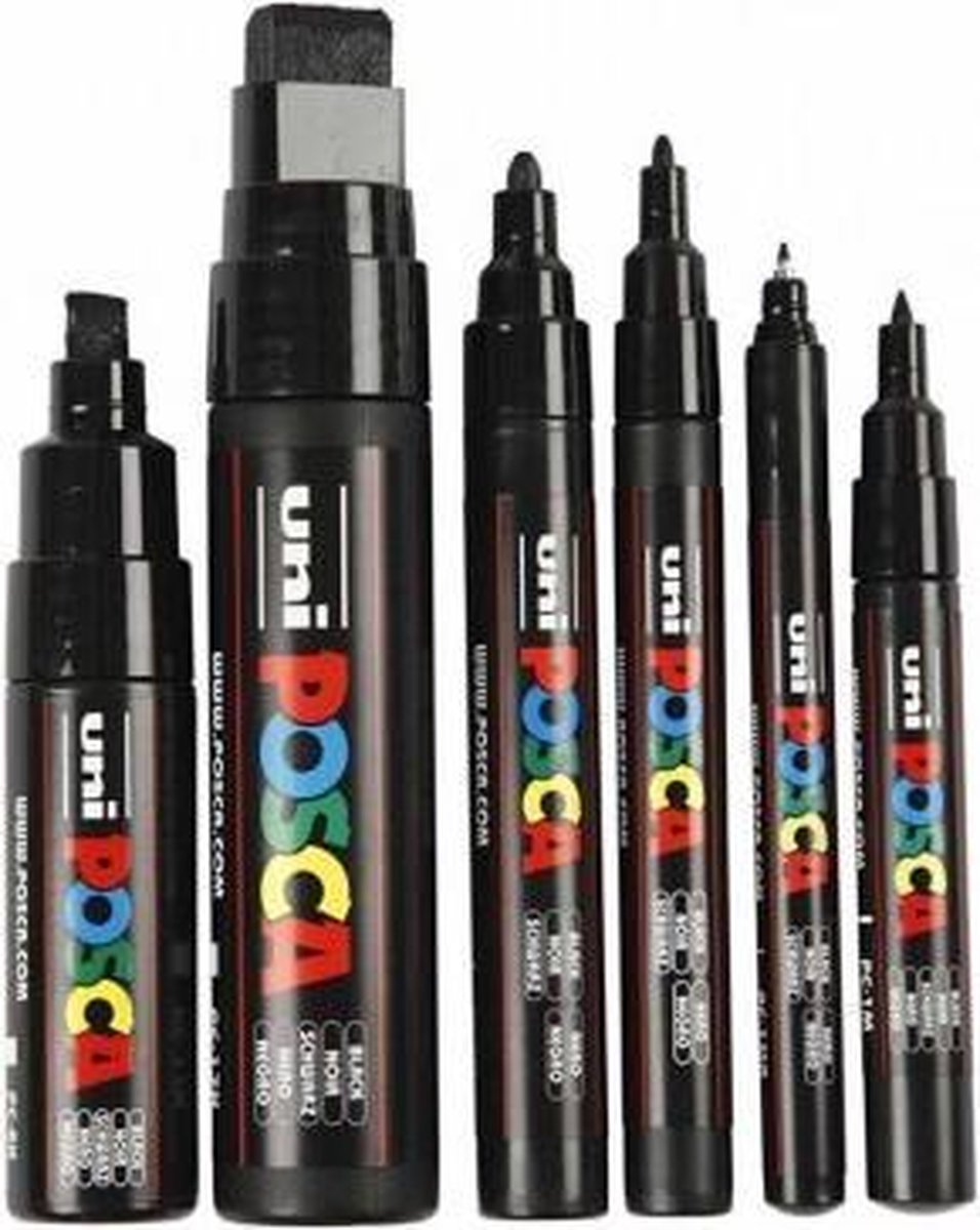 Het lijkt op acrylverf, is dekkend en ondoorschijnend. Zonder alcohol en oplosmiddel, reukloos, sneldrogend en trekt niet in het papier. Het is verwijderbaar van een gladde ondergrond zoals glas. Deze set bevat 6 stiften in de kleur zwart in diktes varieerend van 0,7 mm tot en met 15 mm