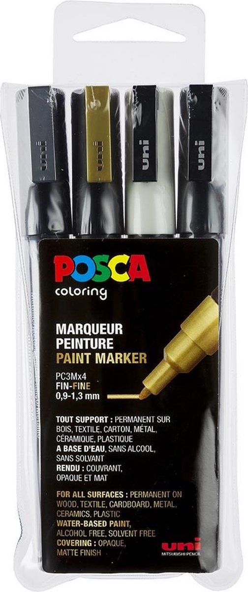 Uni Posca Verfstiftenset. Een dekkende, lichtechte viltstift op waterbasis voor bijna elke ondergrond. Maat 0,9-1,3mm, PC3M. Set met 4 kleuren: zwart, wit, goud en zilver. Uitvoering in kunststof etui.
