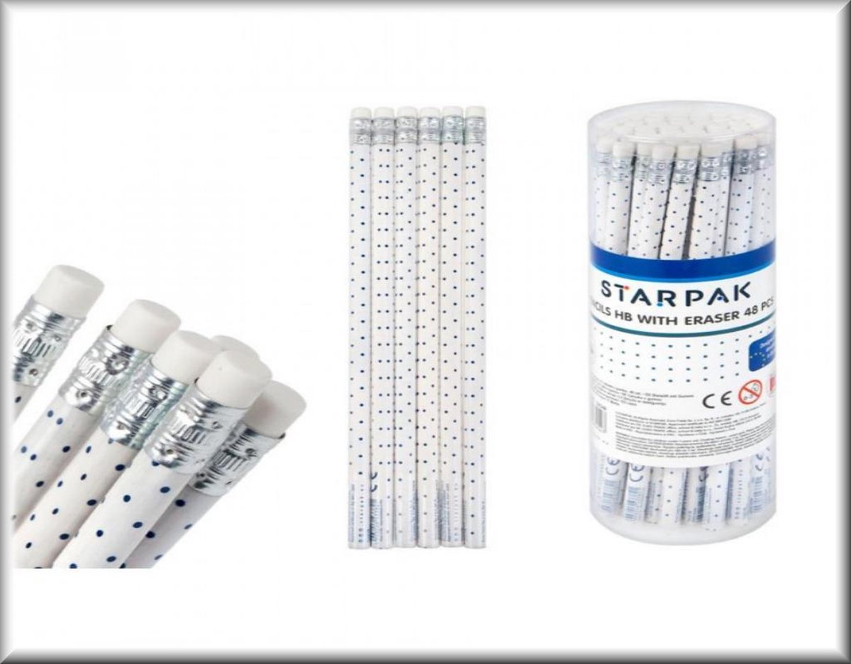Set van 48 potloden met een gum gesloten in een transparante buis uit de Starpak-collectie. elk potlood versierd met kleurrijke gestippelde afbeeldingen. gemaakt van duurzaam hout, biedt comfort van tekenen en schrijven. het potlood breekt niet tijdens het schaven en de gum wordt niet vies. zie ook andere starpak-producten! product bedoeld voor kinderen van 3 jaar of ouder. afmetingen van de verpakking (hoogte x breedte x diepte) [cm]: 20x6x6.