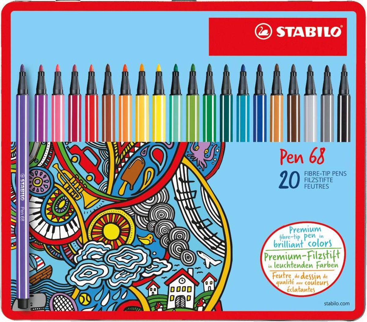 Hoge kwaliteit viltstift met intense kleuren. Metalen doos om de viltstiften te bewaren. Perfect georganiseerd. Inhoud 20 kleuren Pen 68 stiften. Kan tot 24 uur zonder dop, zonder uit te drogen.