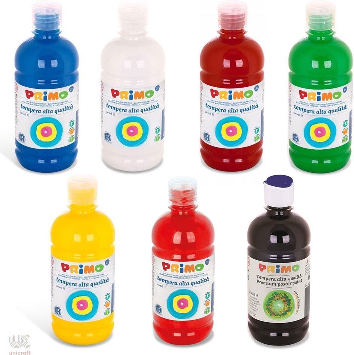 Primo Plakkaatverf, pakket met 7 flessen van 500 ml. Set bevat de kleuren: wit, helblauw, bruin, geel, rood, zwart en groen. Ideale kleuren om de mooiste kleurencombinaties te maken!