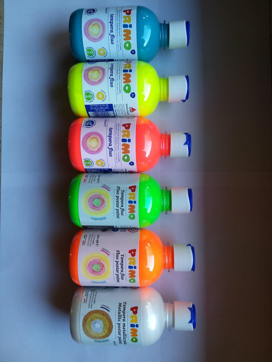 Primo Plakkaatverf, pakket met 6 flessen van 300 ml. Assortiment : Fluoverf. Kleuren : Fluo-geel, Fluo-groen, Fluo-roze, Fluo-oranje, Fluo-blauw, wit. U ontvangt een extra mengpalletje bij dit pakket om de kleuren apart te kunnen mengen tot nieuwe kleuren.