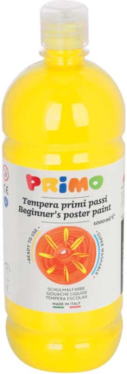 Primo Tempera plakkaatverf Verf er maar op los! Met deze supergrote verffles is dat mogelijk. De verf is ook ideaal om te gebruiken om andere kleuren verven te mengen. Specificaties: Kleur: geel Geslacht: unisex Materiaal: kunststof Inhoud: 1000 ml Leeftijd: vanaf 4 jaar