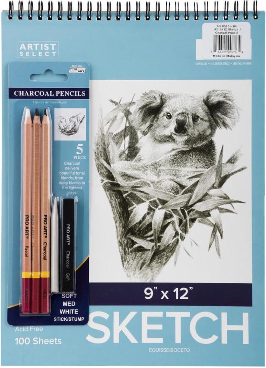 Artist Select-Drawing Pad & Pencils. Spiraalgebonden pad, fijn oppervlakpapier Het tekenblok bevat 100 vellen zuurvrij papier van 70 lb. Spiraalgebonden pad, fijne oppervlaktepapier die netjes uitwissen en gemakkelijk mengen. Inclusief 5-delige Pro Art Charcoal potloodset - 3 potloden, mengstaaf en houtskoolgum.