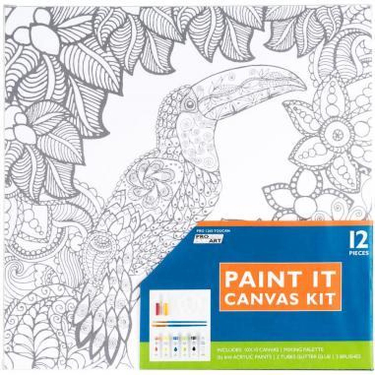 Voorbedrukt canvas van een toekan in mandala stijl om zelf naar eigen smaak in te kleuren. In de set zit ook een palette, 6 kleuren acrylverf, 2 tubes glitterlijm en 2 penselen