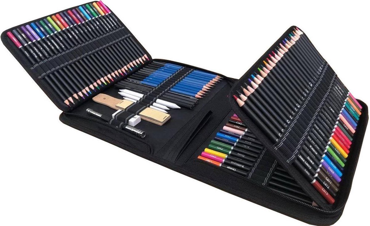 Uitgebreide tekenset De professionele 144-delige potloden tekenset bevat alle benodigdheden om de meest geweldige tekeningen te maken. In de set zijn de volgende items inbegrepen: ? 120 Stuks kleurpotloden ? 12 Stuks schetspotloden ? 3 Stuks houtskoolpotloden ? 3 Stuks blending stronken ? 1 Schetsblok ? 1 Puntenslijper ? 1 Vinyl gum ? 1 Potloodvergroter ? 1 Schuurpapierblok ? 1 Grafietpotlood ? 1 Etui