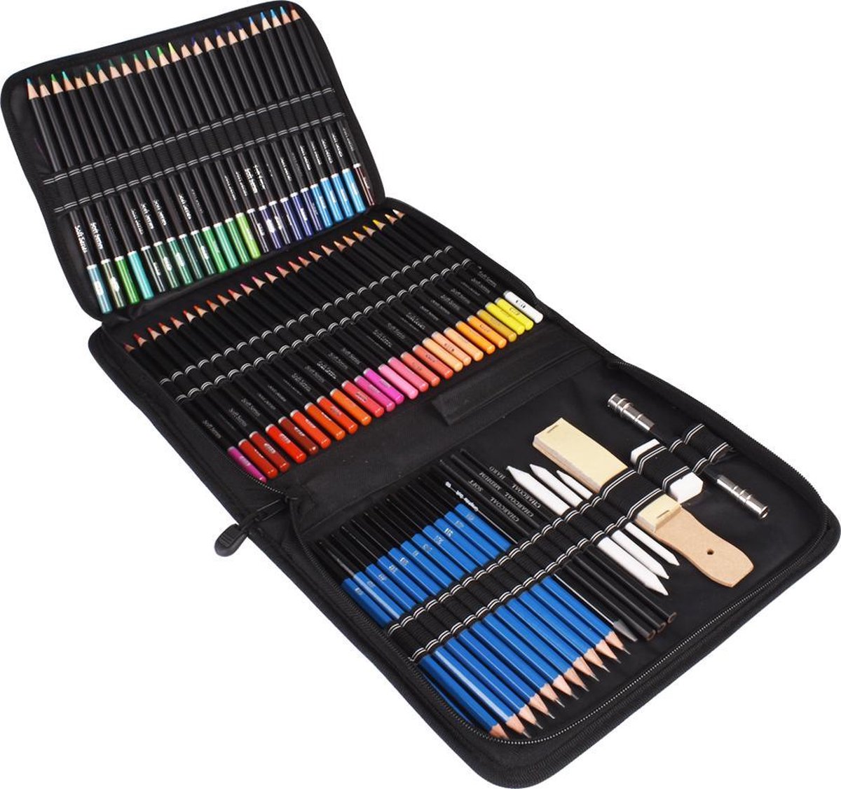 De set bestaat o.a. uit 12 professionele schetspotloden met verschillende soorten hardheden, van een fijne 9H tot een zachte 9B, 12 professionele kleurpotloden, 12 professionele metallic kleurpotloden, 12 houtskoolpotloden en 12 aquarelpotloden! De set bevat ook: 3 stuks mengpotloden 1 stuk schuurpapierblok 1 stuk vinyl gum 1 stuk metalen dubbele puntenslijper 1 stuk potloodverlenger 1 artis-penseel 1 marker 1 stanleymes 1 A5 schetsboek Het is ook een prachtig cadeau voor tekenliefhebbers of als jezelf graag ervan houdt om te tekenen of wilt leren tekenen. Ook leuk voor kinderen en goed voor hun fijne motoriek en visuele creativiteit. De tekenset zit in een luxe opberg-etui.