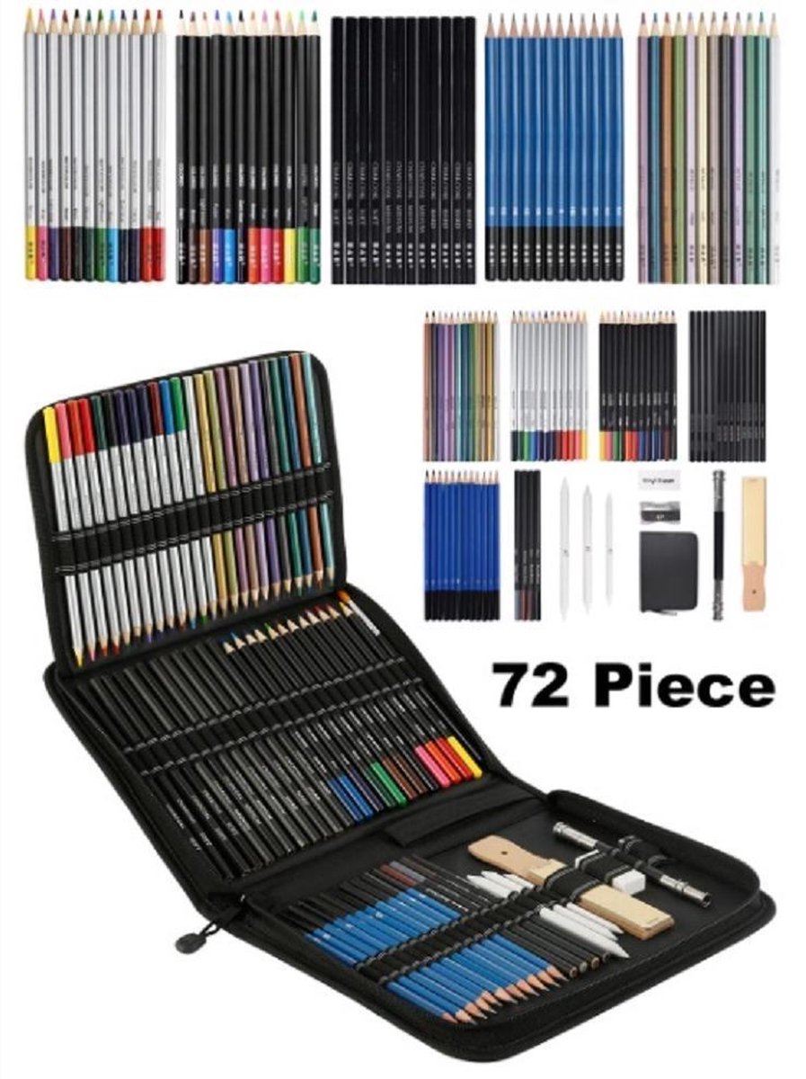 Professionele tekenset voor jong en oud Met deze set heb je alle noodzakelijke tools in één handige opbergtas om de meest creatieve werken kunnen maken. Deze set is geschikt voor zowel beginners als voor de meer gevorderde kunstenaar. De potloden tekenset biedt alle mogelijkheden om leuke kunstwerken te maken. Deze potloden en stokken zijn beschikbaar in een soft, medium en hard variant, zodat jij voor iedere tekening meer dan genoeg keuze hebt. Package Including: 12 Stuks metallic potloden 12 Stuks Aquarelpotloden 1 Artis-penseel 12 Stuks kleurpotloden 12 Stuks houtskoolpotloden (Soft – Medium – Hard) 1 Puntenslijper 1 Vinyl gum 1 Potlood verlenger 1 Schuurpapierblok 3 Stuks Mengstronken 4 Stuks Pastel potloden 12 Stuks schetspotloden