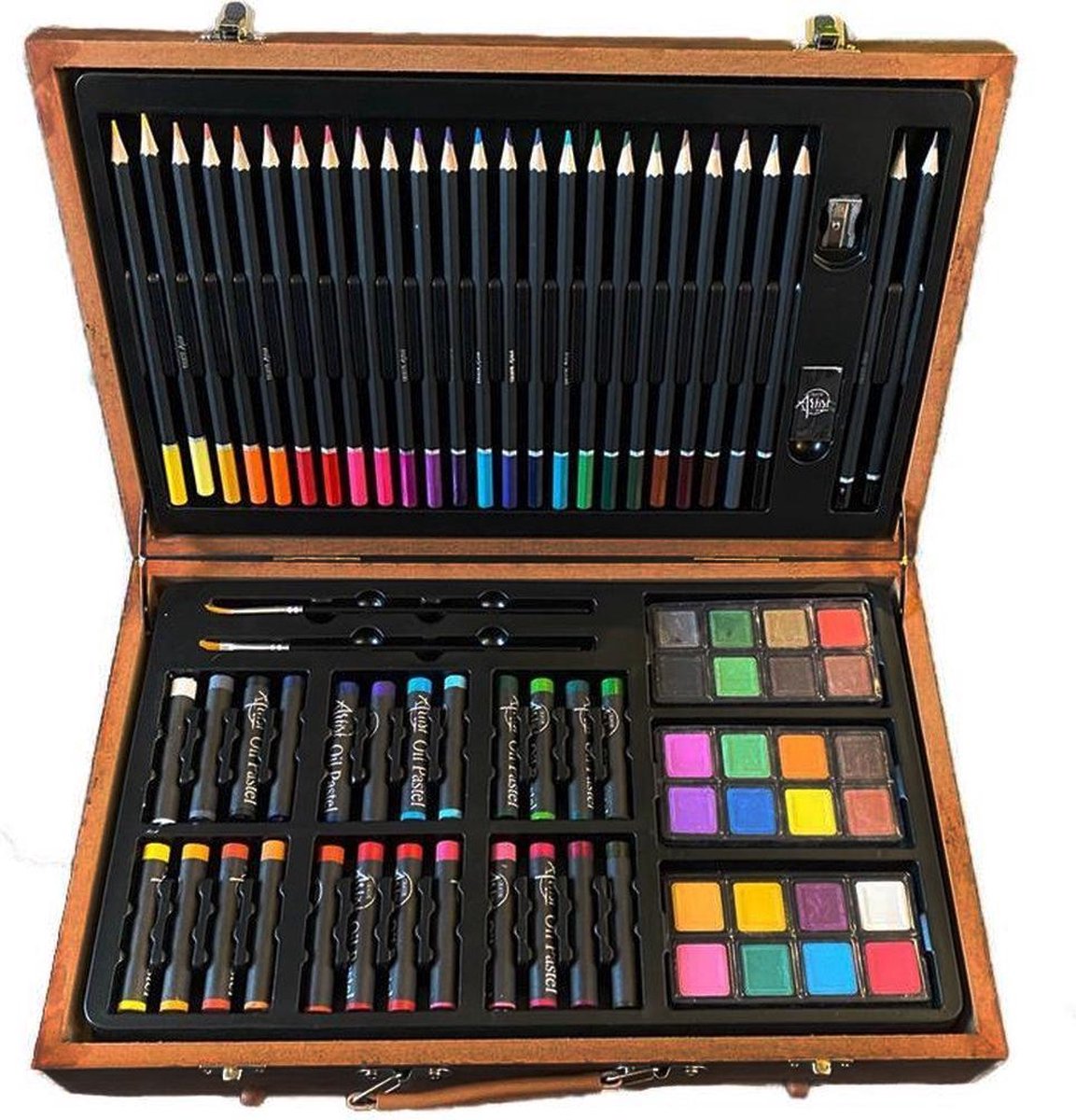Haal de kunstenaar in jezelf naar boven met deze luxe schilder- en tekenset. Hiermee heb je alles bij de hand om de mooiste creaties te maken. Deze profecionele houten koffer met uitgebreide teken- en schilderset is voorzien van verschillende kleuren potloden, verf, krijt en stiften. De limited edition is in beperkte voorraad beschikbaar, dus wacht niet te lang! Specificaties Hoeveelheid: 112 delig ?Kleur: Multicolor Soort kunstenaarsverf/-kleurstof: Acrylverf voor kunstenaars,Waterverf voor kunstenaars,Olieverf voor kunstenaars Afmeting: 8 x 37.9 x 23.2 cm Voordelen ? Uitgebreide teken- en schilderset ? Gemaakt van 100% natuurlijke materialen ? Voorzien van verschillende kleuren potloden, verf, krijt en stiften ? Multifunctioneel ? Overzichtelijk ? Inclusief stevige houten koffer ? Limited edition! Over WDMT™ WDMT™ in een inovatief merk welke haar oorsprong vindt in het hart van de kleurrijke Duin en Bollenstreek. De afkorting van WDMT™ staat voor Wood More Thing™. De