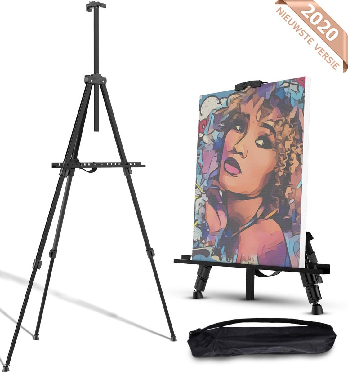 Wil jij jouw schilderkunsten tonen aan de buitenwereld? En wil jij je meten met de kunsten van Picasso? Dan is deze schildersezel een must have! Met deze professionele schildersezel is dit een unieke kans om succesvol aan de slag te gaan. Met deze lichte aluminium standaard inclusief draagtas kun je overal schilderen. De pluspunten van deze schildersezel ? 2 jaar garantie ?Instelbare hoogtes ?Inclusief draagtas en anti slip aan de onderkant ?Compacte opvouwbare schildersezel Het luxe stabiele product is voorzien van een instelbare hoogte zodat je op iedere lengte kunt schilderen. De ezel is opvouwbaar en voorzien aan de poten van een anti slip laag, zodat de ezel altijd stevig blijft staan ten alle tijden. De verstalbare hoogte vindt plaats van 63cm tot 178cm. De breedte van kan worden uitgeklapt tot 110cm. De afmeting is 60 x 10 x 10 cm en voorzien van twee handvaten. Dankzij de draagtas kun je de veldezel makkelijk meenemen naar verschillende locatie en draagt maar liefst 1,2 kg