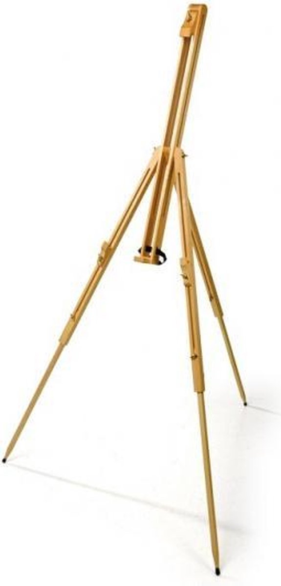 Professionele schildersezel van hout. Professionele schildersezel met traploos in de hoogte verstelbare steunen. De beide achterste poten kunnen in verschillende hoeken worden vastgezet, zo kan de schildersezel ook op oneffen ondergronden goed worden neergezet. Fantastische afbeeldingen van landschappen, mensen, dieren of huizen zullen hier met creativiteit en wat talent hun weg naar het doek vinden! Ongeveer 140 x 60 x 60 cm groot.