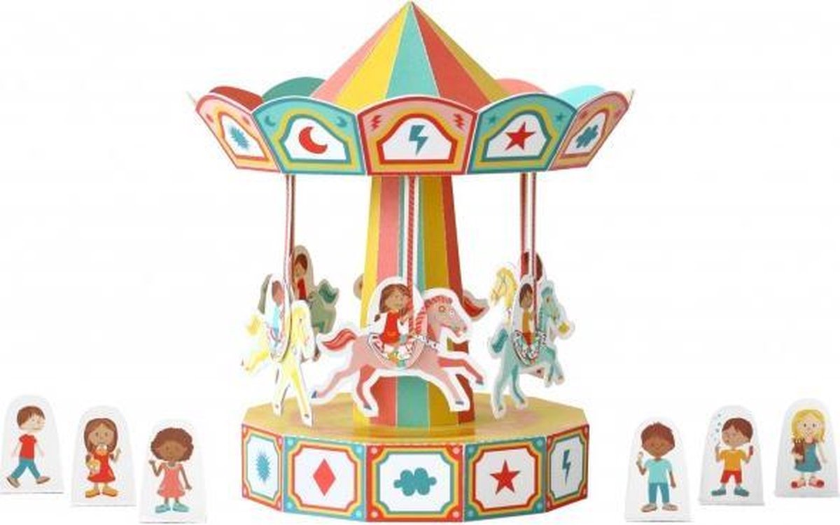 Deze Pukaca draaimolen of carousel van papier kan echt bewegen! Nadat je eerst geknipt gevouwen en geplakt hebt; kun je ermee spelen. Want het carousel kan echt draaien. Deze set Pukaca draaimolen bestaat uit 8 vellen hoog kwaliteit 100% gerecycled papier met 1 carousel, 6 figuren en 6 accessoires. Alleen een schaar en lijm nodig.