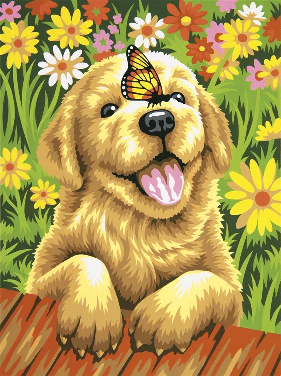 Puppy met vlinder Schilderen op nummer. Je maakt Schilder op nummer schilderij in het formaat . Je ontvangt een los canvas met daarop enkel de lijnen en nummers. Door de genummerde vlakken in te schilderen met de juiste kleuren verf, creëer je je eigen schilderij. Door jou geschilderd met schilder op nummer! Dit schilderij wordt geleverd inclusief: -Canvas met lijnen en nummers -Voldoende potjes en kleuren acrylverf -Penseel. Schilderijen kunnen licht afwijken van de productafbeelding.