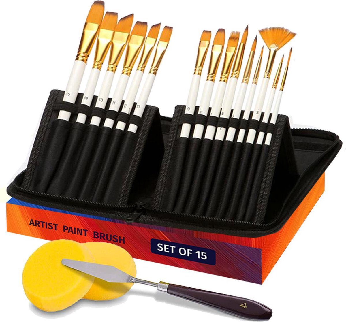 Qbix penselen set met 15 schilderskwasten Deze Qbix kastenset is een complete schilderset waarmee je gelijk aan de slag kunt. De penselen zijn gemaakt uit hoogwaardige materialen en bevat 15 schilderskwasten, 2 schilder sponzen, 1 paletmes / schraper en een handige draagtas met rits sluiting om je kwasten in te bewaren. Deze kwasten zijn multi inzetbaar voor acrylverf, olieverf, waterverf, schmink, gouache en inkt. Eigenschappen ? Grootte: 170 mm / 6,69 inch house handgreep over de volledige lengte, ligt goed in de hand. Makkelijk te dragen met een afneembare draagtas. ? Soft Brush Hair: het hoogwaardige synthetische nylon haar heeft een goede elasticiteit en kan na gebruik perfect de vorm herstellen. ? Gemakkelijk schoon te maken: na gebruik van de borstel wordt de verf gewassen met warm water en wordt de borstel opnieuw gevormd. ? Kwasten bewaren - de draagtas kan worden gebruikt als een pop-up standaard, waarmee u gemakkelijk borstels kunt verwisselen terwijl u werkt. ? Het zijn