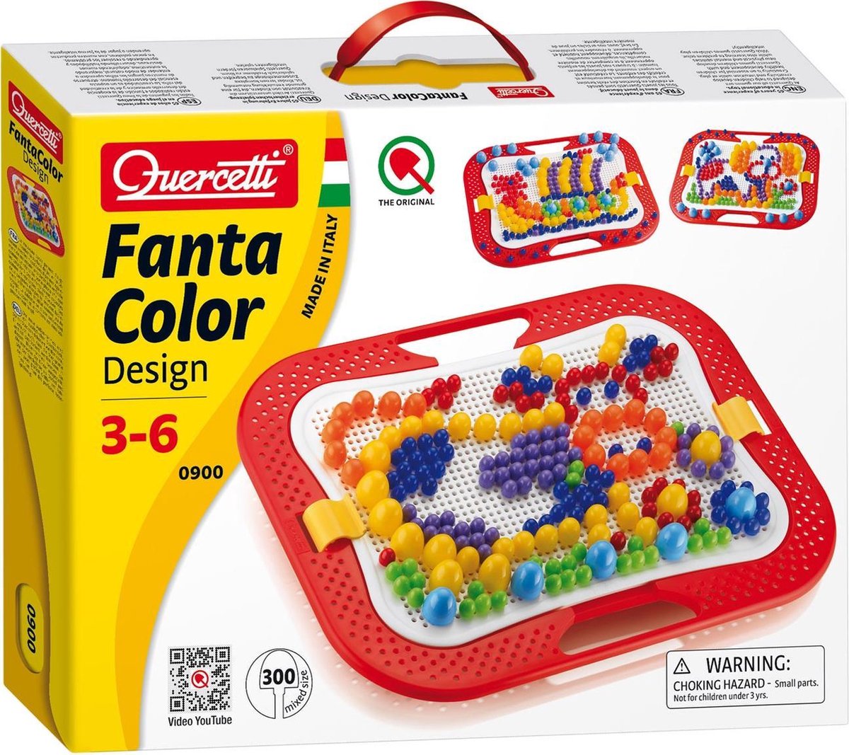 Deze Quercetti FantaColor Design set is met zijn nieuwe externe bord met 300 pinnen in verschillende kleuren en 3 verschillende maten (10, 15, en 20mm.), afgeronde hoeken en handige sluiting één van de beste aanbiedingen qua inventiviteit, veiligheid en doelgerichtheid van de FantaColor Design collectie. Het bord kan ook rechtop staan zoals een fotolijstje. Zo kunnen de meesterwerken van de kinderen makkelijk getoond worden. Dankzij het ingebouwde handvat neem je het makkelijk mee op reis. Het bord klikt stevig vast en alle onderdelen zitten veilig opgeborgen om overal mee te nemen. De set bevat ook een voorbeeldboekje. Om opnieuw te beginnen draai het bord gewoon om boven het opbergvak en druk de pinnen er uit. Geschikt voor kinderen vanaf 4 jaar.